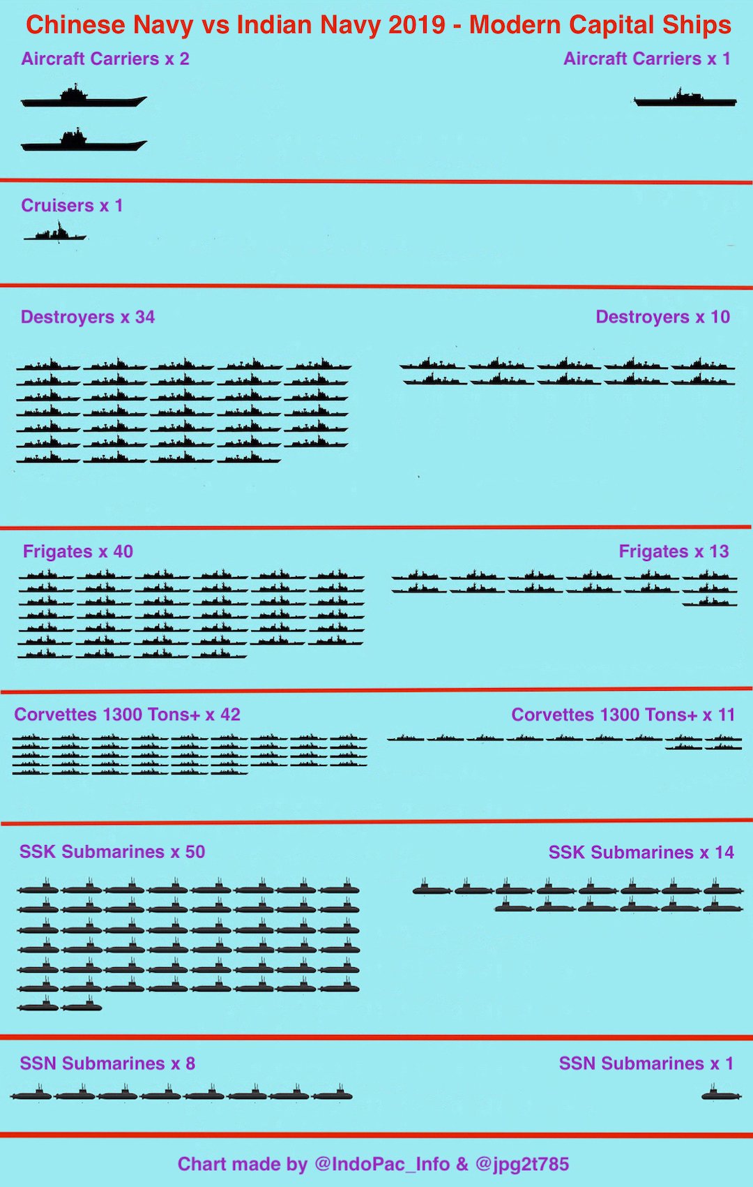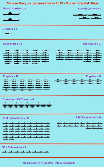 Poniżej ilustracje porównujące liczebność floty Chin do kolejno floty japońskiej, indyjskiej i amerykańskiej.